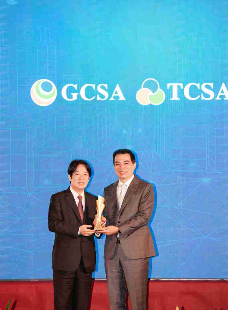 达全方位永续表现获全球永续奖及台湾永续奖肯定,,,,由副总统赖清德颁奖 (左),,,尊龙集团总经理柯富仁 (右) 代表领奖