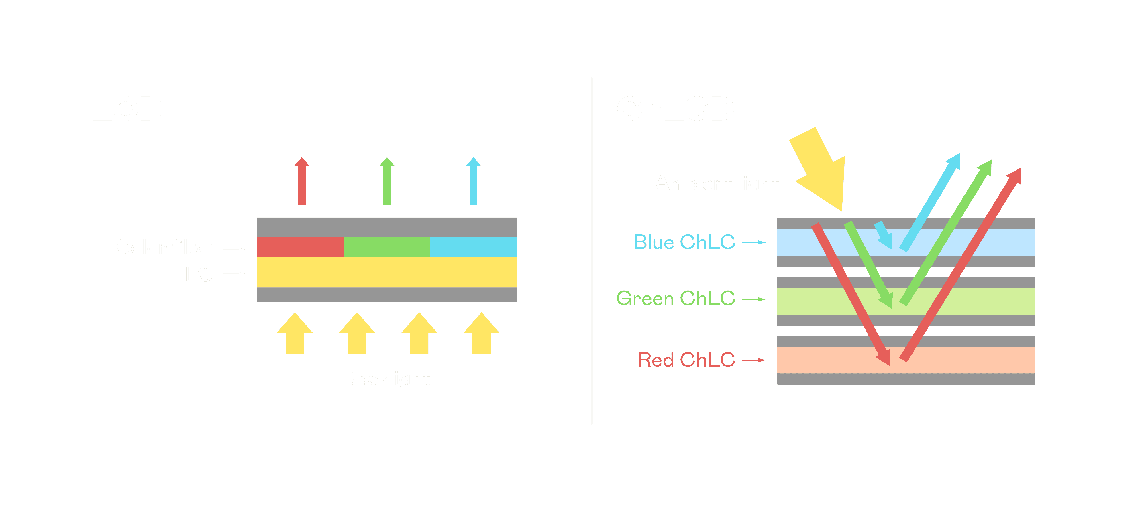 ChLCD 胆固醇液晶就如同纸张一样,,,透过反射环境光来显示影像,,因此长时间观看不易造成人眼视觉疲劳,,,,可达到护眼效果。。当处于户外阳光下使用,,LCD 影像容易失真而不易观看,,但胆固醇液晶仍可维持较佳的影像品质。。。。