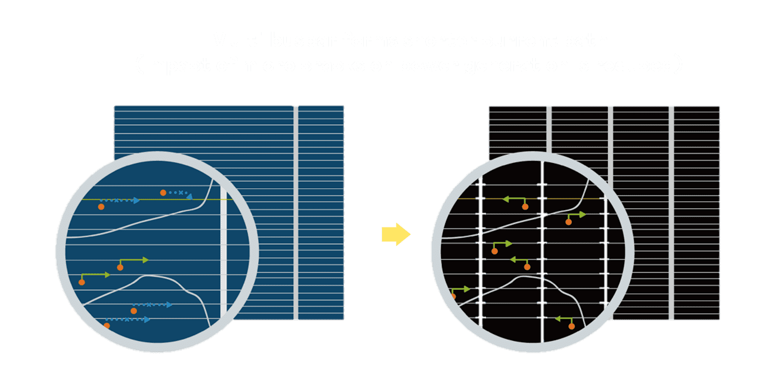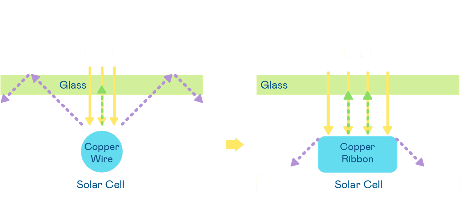 • 电池使用多条铜导线 (Copper wire) 于电池片上形成较短的电流路径,,,,提高电流收集效率,,,,采用圆形设计的铜导线较传统扁平式的铜焊带 (Ribbon),,可增加入射至电池的光线量。。。