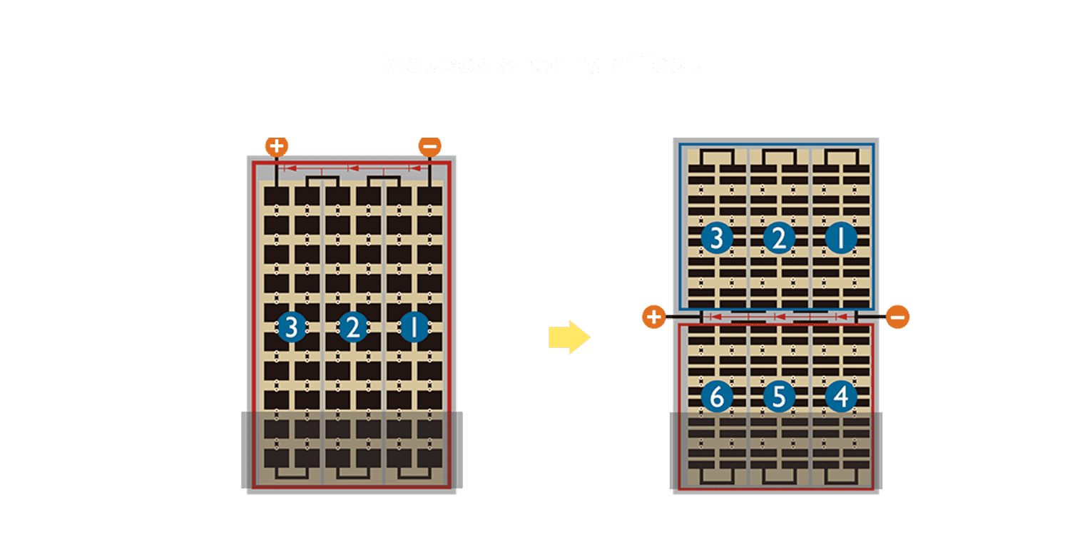 • 结合半切电池,,,,降低遮阴影响、、、提升模组抗隐裂能力、、并减少电阻损耗,,,进一步提升模组发电效能。。